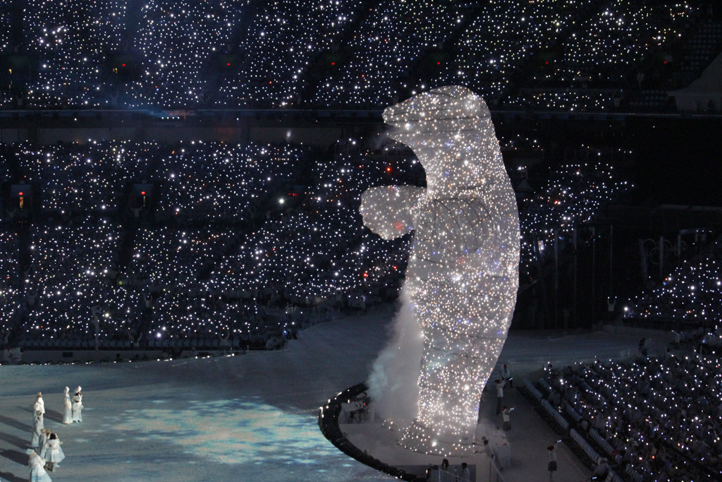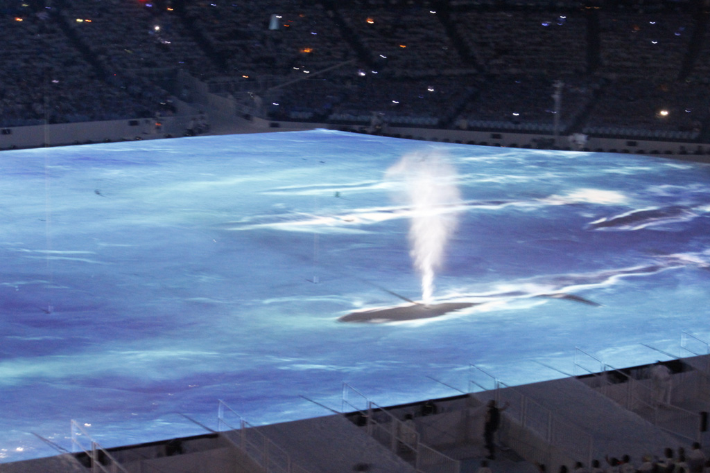 I quite liked the Scottish dancing hooligans and the "I am Canadian" poem — actually entitled "We Are More" by Shane Koyczan — and, as for "standing up to the Beijing OCs," I think they pulled off some very cool visual effects. Most impressive were the giant fiber optic polar bear towering over a tribe of ice age eskimos before melting down and vanishing between the floes of "ice" breaking up beneath its feet, and the pod of Orca whales that appeared to circle just beneath the stadium floor, spouting into the air and breaking the surface of an illusory ocean composed entirely of light and fog.