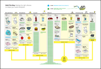 One of their Most Popular Infographics of 2009 is called Walk This Way: Making the right choices to reduce your water footprint. It includes such vital statistical data as which alcoholic beverage is more water-intensive, beer or wine. To my personal dismay, they don't mention vodka... but maybe what I don't know won't hurt me. Strange omissions abound, once you start analyzing it; like why they choose to contrast the water usage of a typical bath, not with a timed shower but with "no bath," which for most of us would be a grim non-option at best.