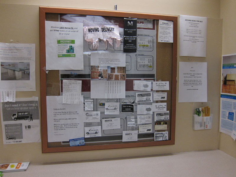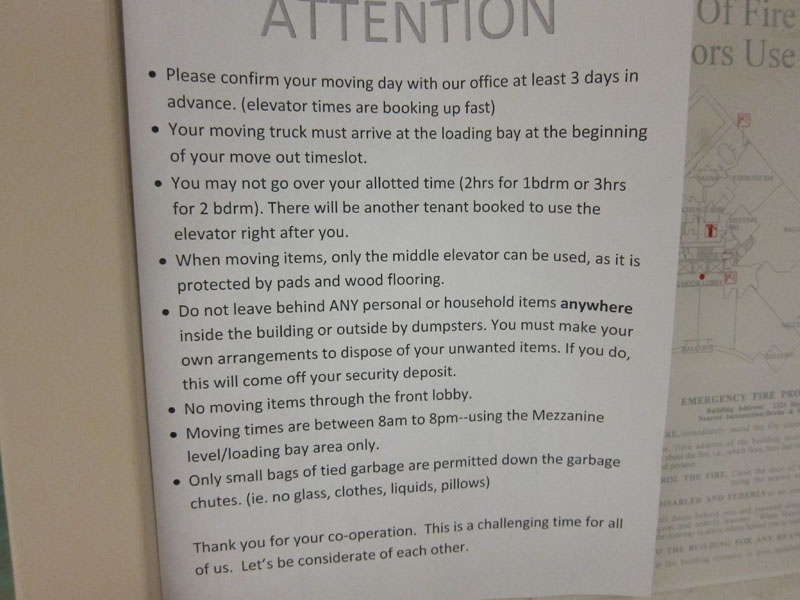 At first I thought we would see the message board downstairs flooded with items for sale as people scrambled to offload their possessions before moving, but I think everyone realized pretty quickly that we're all in the same boat and no one wants to leave with more shit than they came with. When you consider the sad dollar-per-square-foot comparison between our soon to be ex-apartments and the average on offer downtown — even after you accept that you'll be dishing out more money, there isn't much on the market that compares to this building's proportions — most of our neighbors will probably be forced to choose between downsizing and moving to the suburbs (or as some like to call it, thinking of this as an opportunity).