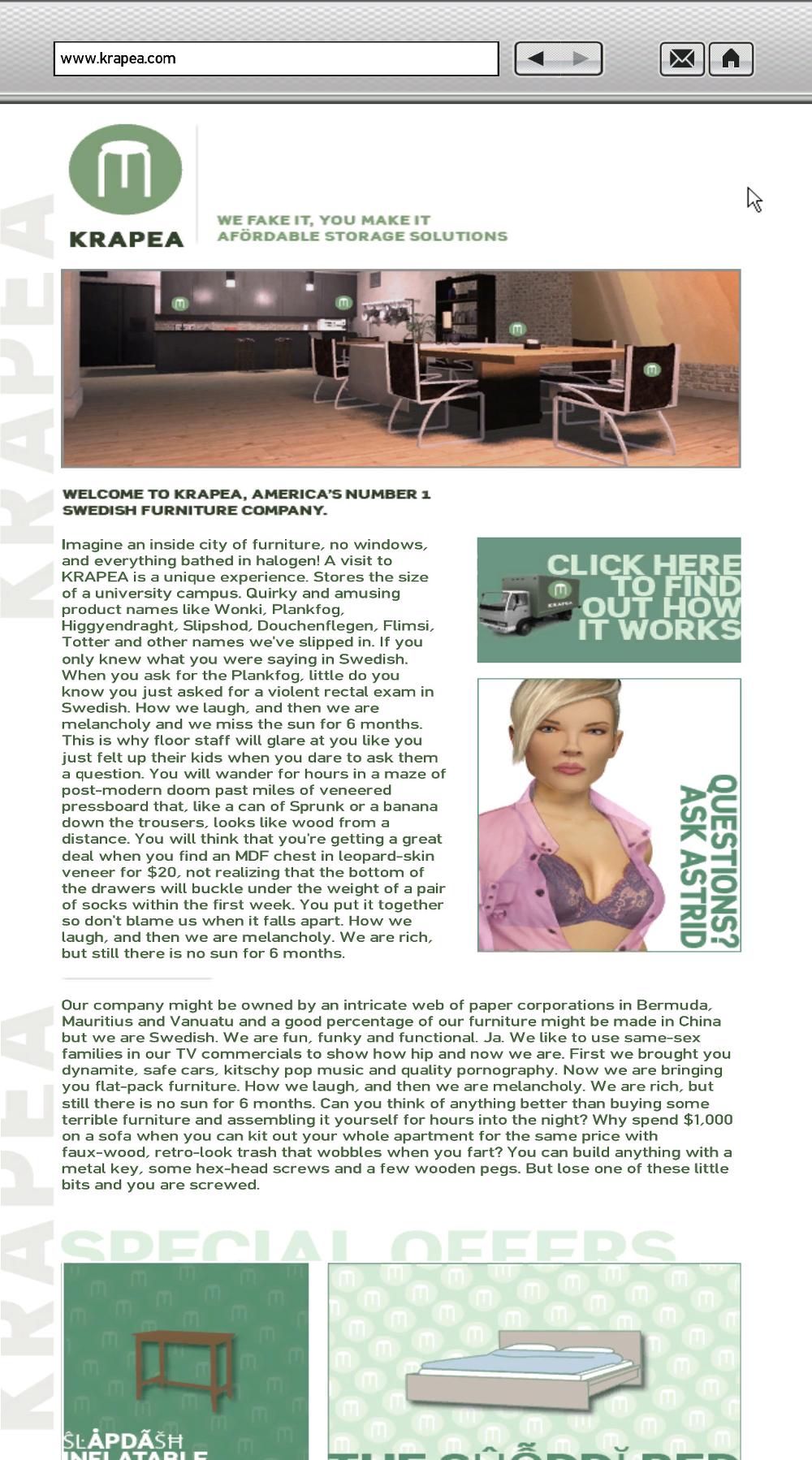 So, in Grand Theft Auto IV you can go online — not "real" online, but a place where you can send and receive email, set up dates with random women and, if you're like us, check out the fake ads and weird news stories summarizing your latest "mission" from the perspective of the innocent bystanders who have to live in a city where every day brings another multi-casualty shootout between police and the organized criminals who always seem to kick their asses. The ads, however, are where you will find the Easter eggs (or as Davidology puts it: "full on mother fucking lulz"), like this ad for Krapea, a scathingly hysterical diatribe against IKEA that goes on for five pages and makes you wonder, of all the people who play this game, what percentage will ever even know this is here, let alone read all of it? Then if you're like us, you'll scour the real internet hoping someone has transcribed and posted this mini-masterpiece so you can quote it and link to it on your website, and when you do find it because of course someone has done exactly that, you will be amazed but not at all surprised, and it will give you a warm fuzzy feeling about the Internet and this whole crazy world we've created and are creating.