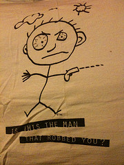 In the final seconds of the commercial (and in my mind every time I walked by his office) it was held triumphantly aloft by the overly confident police sketch artist as the visual punchline accompanying his single line of dialogue: "Is THIS the man who robbed you?" At which point the victim, who has just finished giving his painstaking description of the perpetrator with plenty of helpful details, sputters indignantly, "You can't draw!" It is hilarious.