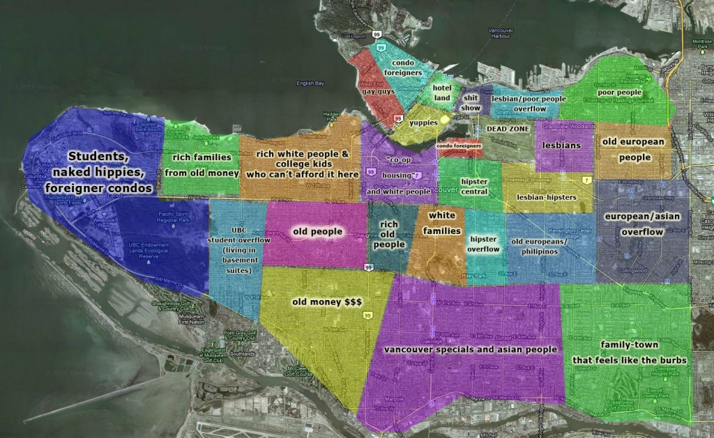 I gave up on the Vancouver map after repeatedly clicking one neighborhood I was sure was Strathcona to no avail, and was forced to conclude that the app was broken. But then, I live downtown ("yuppies" on the map below) and if I have to cross a bridge to get there, I probably don't know about it.