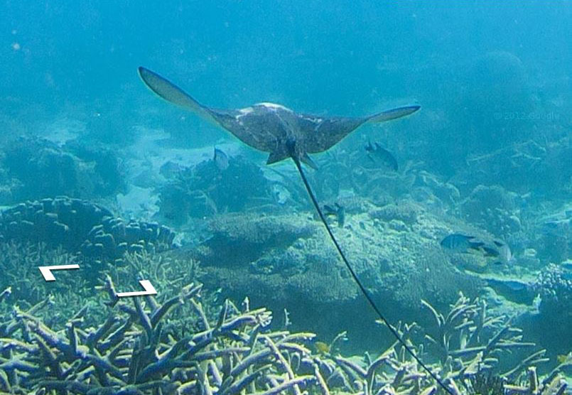At which point Mr. Pink studied my screen for a few seconds and concluded that it was "much smaller" than the one he had encountered while scuba diving off the Grand Cayman Islands (in real life). He had been diving about 10 feet down looking at coral and little fish when a massive shadow suddenly loomed above, casting everything around him into darkness. He instinctively froze in place, heart pounding in his throat even before he spotted the source of the drop in temperature and visibility; a giant black manta ray with a six-foot wingspan that slowly glided by maybe halfway between him and the surface of the water. (When he tells the story, I picture the scene in Star Wars when the Death Star passes overhead blotting out the rest of the stars.)