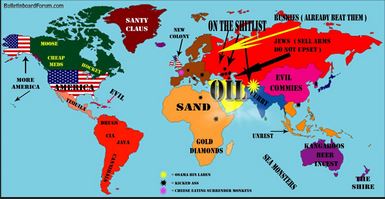 Most of what I know about the rest of the world came after graduation, but what little I did learn in class took place in private schools, the first in Seattle (thanks to mandatory busing laws and, much as I hate to say it, white flight) and one in Virginia. The most memorable and useful educational experience of my life was without question a class called "Humanities" in 9th grade. It was basically a sweeping history of the Western world and covered such diverse topics as classical music, religious wars, medieval and Renaissance politics, colonialism, the art of the ancient world and how you can basically trace the development of the Western mind through depictions of the human form in sculpture. Even so, 50% of what I learned in high school was US History and we all know that to the US, the world looks like this:
