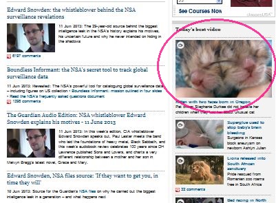 So, obviously the big news this week is about NSA whistle blower Edward Snowden and his revelations/confirmations of your worst fears about the US government as panopticon police state, vacuuming up every conversation and transaction conducted or transmitted on the world's inescapably entangled web of spyware-enabled, geo-locating, face-recognizing devices. The best coverage is by Glenn Greenwald at The Guardian, if you can avoid the two-faced kitten strategically/democratically placed on the page to test your resolve... Guarding the entrance, Cerberuslike, if you will.