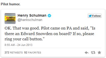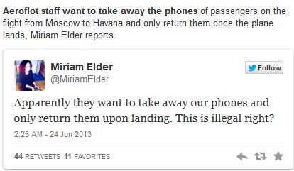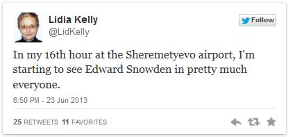After waiting several hours to board a plane to Cuba, which was believed to be the next stop in Snowden's No Sleep 'til Extradition tour, British journalists got a little punchy and began posting photos of guys who looked nothing like him, then quickly retracting same, speculating that the airport was crawling with Ecuadorian diplomats and "plain-clothed Russian agents" and attempting to interview other people who were milling around trying to interview people. Here are two of my favorite Tweets from the Guardian and Reuters reporters' as they documented their own descents into paranoid delirium: