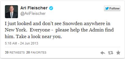 By the middle of the day, Dick Cheney and John Kerry had weighed in with messages that were uncomfortably harmonious; Kerry to issue vague threats towards China and Russia if they're caught harboring or assisting the fugitive's escape, and Cheney to brag that he set up the NSA surveillance programs himself after 9-11, and assuring reporters that Congress had been unanimously fine with their complete lack of oversight. Even Ari Fleischer got to snark off on Twitter, answering the prayers of everyone who's been wondering what the former White House press secretary's been getting up to since the good ol' days of the invasion of Iraq.