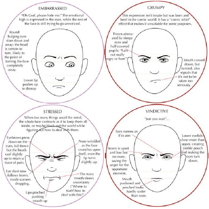 As Joumana Medlej explains, "In drawing facial expressions, we have to bypass 'what a sad face would look like' and aim for 'how we would recognize a face as being sad.' This is because an illustration must make up for the loss of other clues that we have in real life to decipher someone's mood, many of which we perceive unconsciously. In real life, we just know..."