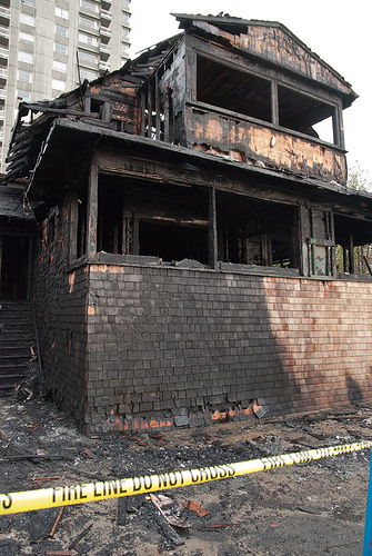 A few years ago I spotted smoke coming from the roof of an old house across the street. I called 911 and was told there had already been more than 25 calls to report it. Fire trucks arrived less than five minutes later, and within 40 minutes the fire was out and they were wrapping up their hoses and walking around taking notes for their report. I can't say if there was any similarity besides the neighborhood and type of structure, though — supposedly no one knew what started this fire and no further evidence has since emerged, not that anyone cared to publish anyway. It just seems incredibly unlikely to me that a fire could grow so far out of control so quickly, surrounded on all sides by people with cameras and phones and all very invested in their own properties not catching a stray spark. So to my mind, it's still half a mystery.