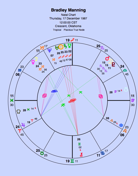 "A Promethean character — a thief of information brought down by the American eagle. He stole millions of documents which spread out across the world like fire... It's no surprise [Manning's] chart is dominated by Uranus. There is the awakener, the alien, the rebel, right next to his Sun in Sagittarius, the sign of the broadcaster."