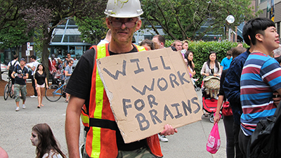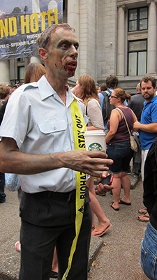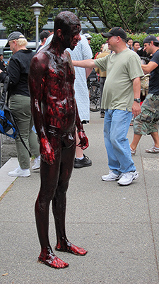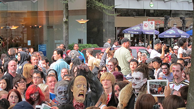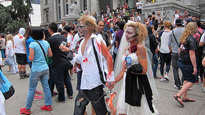 Today was the Zombie Walk, an apparently annual event for which nearly Olympics-sized crowds — herds, hoards, mobs, what-have-you — of the living, walking, bleeding, biting undead throng the plaza of the Vancouver Art Gallery. My friend and I joined an impressive number of onlookers gathered to stare and snap pictures for an hour or so until the Caro Syrup-encrusted masses shuffled off down Robson Street with their bike-mounted police escort, the surrounding sidewalks crowded with spectators taking pictures and heckling from the sidelines.
