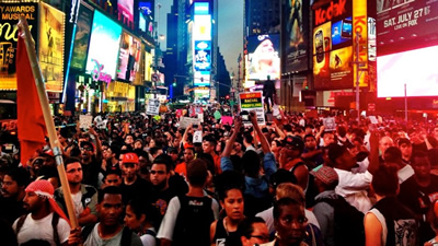 Crowds in New York City protest after the Trayvon Martin murder case ends in an acquittal for George Zimmerman.