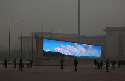During a time of dangerous levels of air pollution, a bright screen shows blue sky. Tiananmen Square, Beijing, China. (Feng Li/Getty Images)