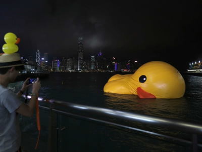 Giant rubber duck deflates in Hong Kong harbor.