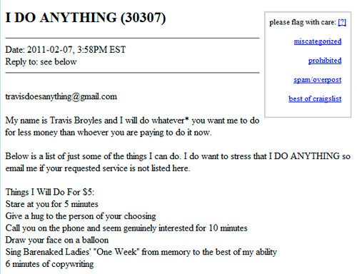 AKA the "I Do Anything" Craigslist Ad Posted by Disgruntled Copywriter Travis Broyles. It was actually posted in 2011, so I hope and assume that Travis has since landed a great job. Unfortunately, I'm either too lazy or too disgruntled myself to search the internet for his name and find the answer more or less instantly. (Or maybe it's nothing more than a simple, absolute certainty that such a search would expose me to far more information about Travis Broyles than I'm willing to ingest. I'm exercising a rare opportunity here and choosing not to know).