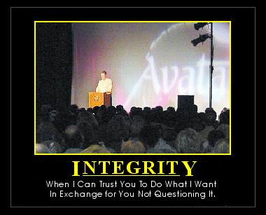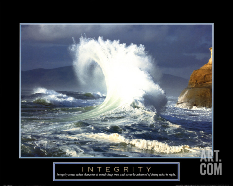 The definition of integrity in the OED is pretty bland; "The quality of being honest and having strong moral principles;" to which the American Heritage Dictionary adds, "moral uprightness," but the awful motivational posters with their solitary waves crashing skyward in improbable Flamenco formations, and their soaring eagles and backlit lions silhouetted against the setting sun provide us with a more modern usage: integrity is having moral courage and the conviction to act in accordance with your ideals, regardless of their popularity, the difficulty or personal risk involved.