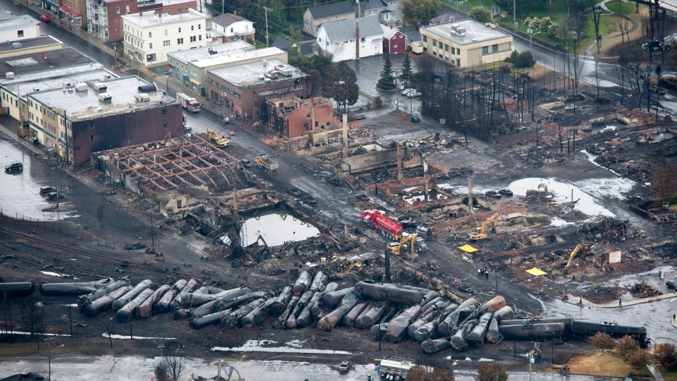 Excerpt from Wikipedia: "Just before the derailment, witnesses recalled observing the train passing through the crossing at an excessive speed with no locomotive lights, infernal noise and sparks emitted from the wheels. People on the terrace at the Musi-Café saw the tank cars leave the track and fled as a blanket of oil generated a ball of fire three times the height of the downtown buildings. Between four and six explosions were reported initially as tank cars ruptured and crude oil escaped along the train's trajectory. Heat from the fires was felt as far as 2 km (1.2 miles) away. People were jumping from the third floor of buildings in the central business district to escape the fire. As the blazing oil flowed over the ground, it entered the town's storm sewer and emerged as huge fire towering from other storm sewer drains, manholes and even chimneys and basements of buildings in the area."