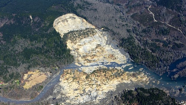 3. Aerial photo of Oso River in Washington State after the mud slide that killed 43 people on March 22. (BBC)