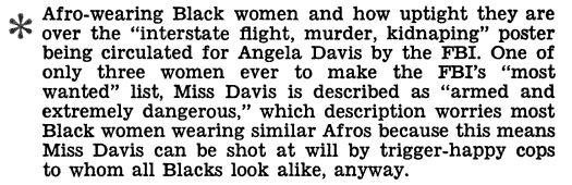 "Christ, if the Panthers don't know how to get it all together, as they say, the tight pants, the tight black turtlenecks, the leather coats, Cuban shades, Afros. But real Afros, not the ones that have been shaped and trimmed like a topiary hedge and sprayed until they have a sheen like acrylic wall-to-wall—but like funky, natural, scraggly. . . wild . . .