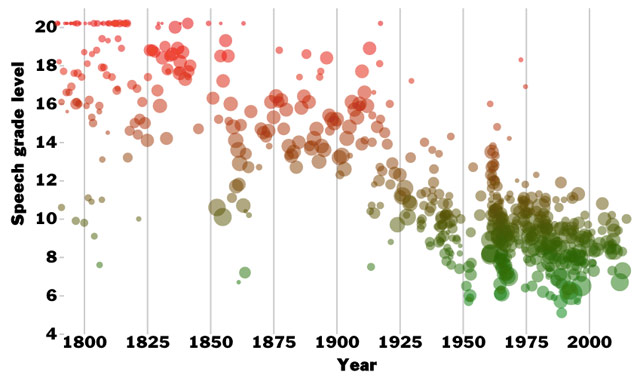 Jeff Shesol, former Clinton speechwriter explains how we should read the graph: "It's tempting to read this as a dumbing down of the bully pulpit, but it's actually a sign of democratization. In the early Republic, presidents could assume that they were speaking to audiences made up mostly of men like themselves: educated, civic-minded landowners. These, of course, were the only Americans with the right to vote. But over time, the franchise expanded and presidential appeals had to reach a broader audience."
