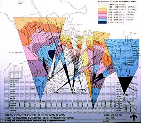 View cones, view corridors, protected views—whatever you want to call them, they're a big fucking deal in Vancouver city planning and real estate development circles. To get a taste for the debate, complete with illustrations like the one below (and proposed revisions to same), check out the Skyscraper page forum.
