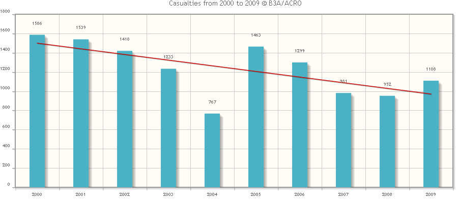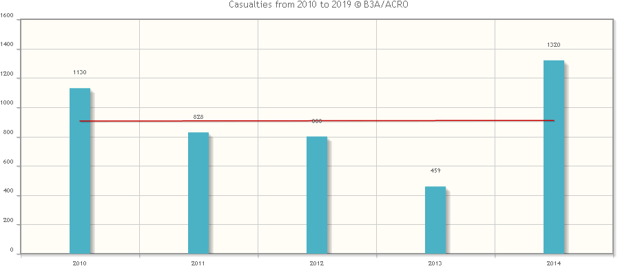 2014 was the worst year for air crash casualties in almost a decade with 1,320, a hopefully temporary blip on a steady downward trajectory going back several years. The bar graphs below show that the trend had been accelerating since 2000, and how we just dipped below 1,000 three years in a row. In 2013 there were fewer than 500 flight-related deaths for the first time since the 1930s. So, yes... I have a site called Bureau of Aircraft Accidents Archives bookmarked but I'm not trolling for tragedy. I'm there to scavenge for good news and I swear I've never clicked the link for "crash pictures" (although, that's not to say doing so would make you a bad person).