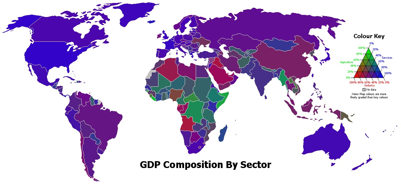 A world map that shows the concentration of national GDP from agriculture (green), industry (red) and services (blue). This looks kind of alarming, but it's probably fine, right? You can go nuts with Wikipedia's Economic maps of the world collection here.