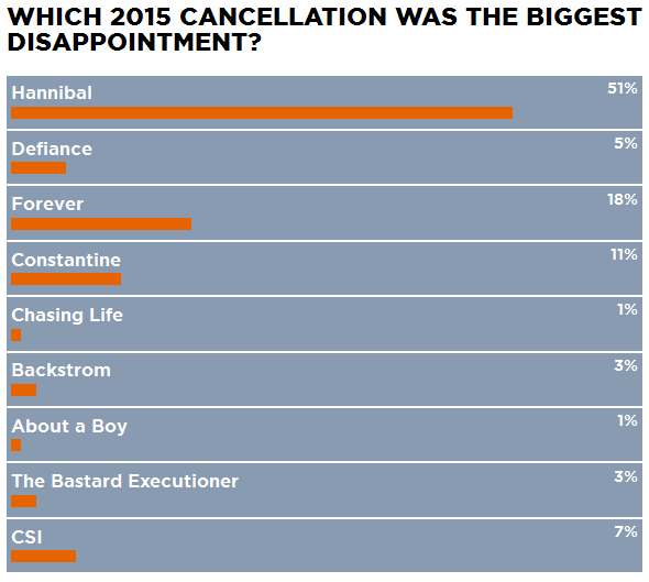 And not just me... According to this CinemaBlend poll, Hannibal's cancellation was the most disappointing of 2015, garnering more votes than all the other cancelled shows combined (including the original CSI).