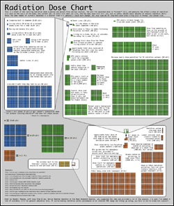 3. Radiation and the USS Ronald Reagan by Peter Lee is just one of many ominous and unsettling stories about damage caused by the release of massive amounts of radiation since the multiple-meltdown at the Fukushima-Daiichi nuclear power plant in 2011. Here's one from the excellent and always terrifying Fukushima Diary: 5 Billion Bq of Strontium-90 flows to the sea every single day. And here's another: 1,000,000 Bq/m3 of Sr-90 detected in seawater of Fukushima plant port / Highest in recorded history and, just to mix things up a bit, here is an excerpt from Randall Monroe's radiation chart, which he posted on XKCD in 2011, showing what various levels of radiation exposure are considered to mean for human health: