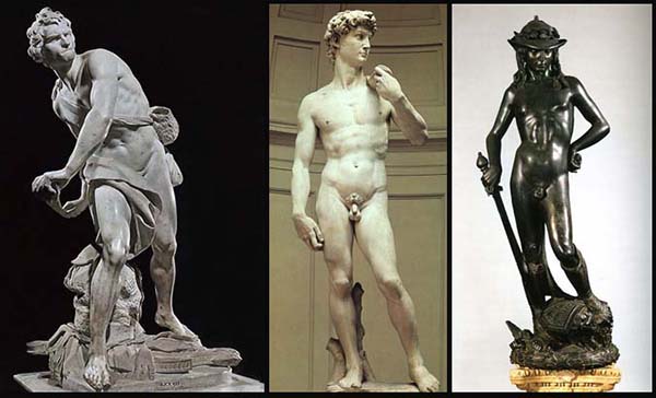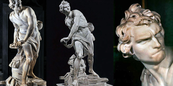 [Bernini's David is so dynamic and hyper-masculine, it makes Michelangelo's David look like Donatello's.]