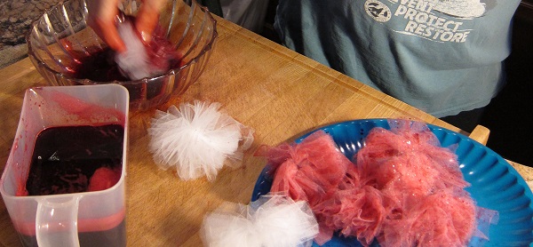 My stepfather was happy to take up the challenge, too, juicing half a dozen beets in order to dip dye a batch of the tulle flowers a lovely pink, since the rules prohibit using chemical dyes.