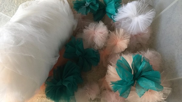 15 minutes in, our call was mysteriously disconnected ;) but my mother later called me from home to show off her purchases. What we ended up with was 10 yards (or ~meters) of slippery emerald green fabric, which I mistakenly assumed to be a stretch knit (more on that later), a sheath-style wedding dress, a full fluffy underskirt, a 10-foot train and yards of tulle netting in white, peach and teal. She quickly found some YouTube tutorials and filled two enormous Tupperware bins with tulle flowers in various colors and sizes.