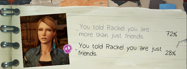 When Rachel comes along, Chloe is thrown off balance, maybe even infatuated... but, oh, video games. You can't play it cool in video games. Keeping silent but making yourself available, making sure the object of your affection makes the first move, while never actually risking yourself is a time-honored method employed through the centuries by your ancestors (they must have, after all, or else where did you learn it??). But in games, playing coy doesn't cut it. Being shy, prevaricating, saying no when you mean yes butplease ask me later... Where does that get you? At the end of chapter one, it gets you lumped in with a lowly 28% of players who declared that Rachel and Chloe were "just friends."